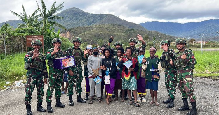 Dogiyai, - Dalam upaya meningkatkan semangat belajar anak-anak di wilayah pedalaman Papua, Satgas Yonif 711/Raksatama melaksanakan kegiatan sosial dengan membagikan alat tulis kepada para pelajar di Kampung Ikebo, Distrik Kamuu, Kabupaten Dogiyai, Papua Tengah.